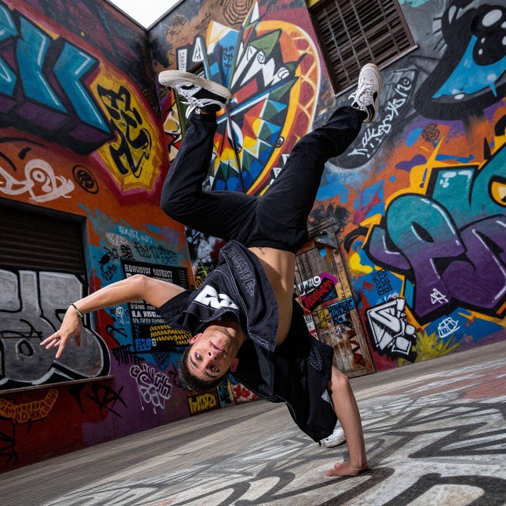 Dynamic Hip Hop Dance Performance: A captivating scene of an energetic young man executing intricate hip hop dance moves, captured from a dramatic Dutch angle perspective, amidst a kaleidoscope of vibrant urban street art murals, graffiti tags, and stencil work adorning the walls behind him. His fluid body language, dynamic poses, and rhythmic footwork are frozen Man has masculine face and piercing eyes