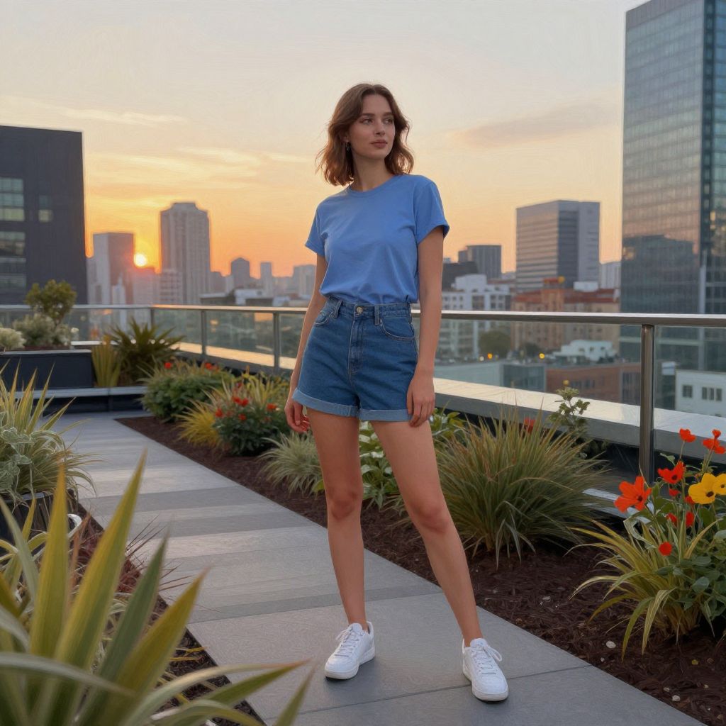 Young white woman in a modern urban setting, standing on a rooftop garden overlooking the city skyline at sunset, wearing a stylish casual outfit, vibrant colors, dynamic composition, digital art with a painterly effect.