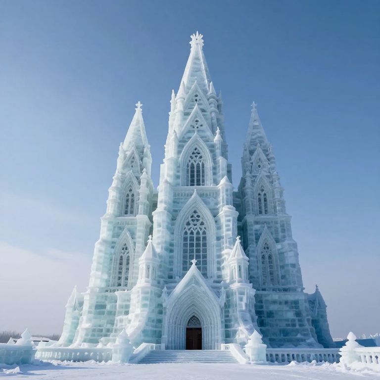 Photograph of an intricately carved ice cathedral with three pointed towers, gothic arches, and detailed windows, set against a clear blue sky.