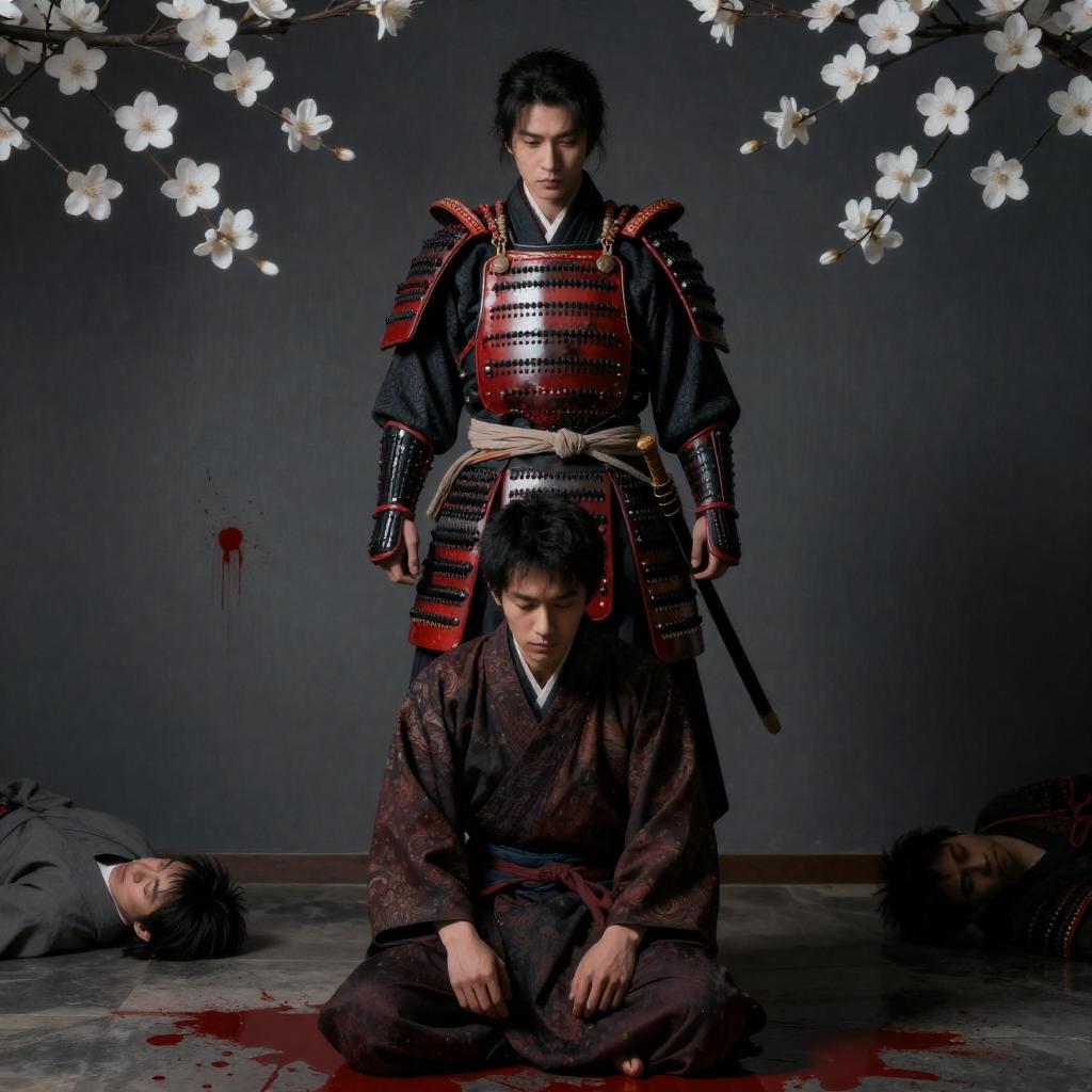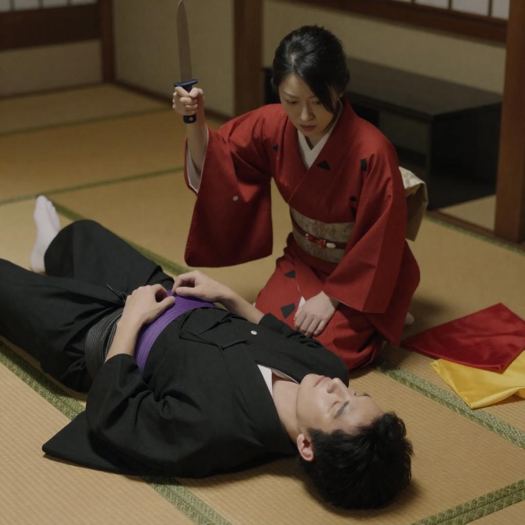 A photograph of two Japanese people on a tatami mat floor. A woman with black hair, wearing a red kimono with black triangular patterns, holds a large knife above a man lying on his back. The man, with short black hair, wears a black kimono and holds a purple ribbon. The woman's expression is intense, while the man's is resigned. Scattered red and yellow fabrics are on the right. The background includes wooden furniture and a patterned floor.