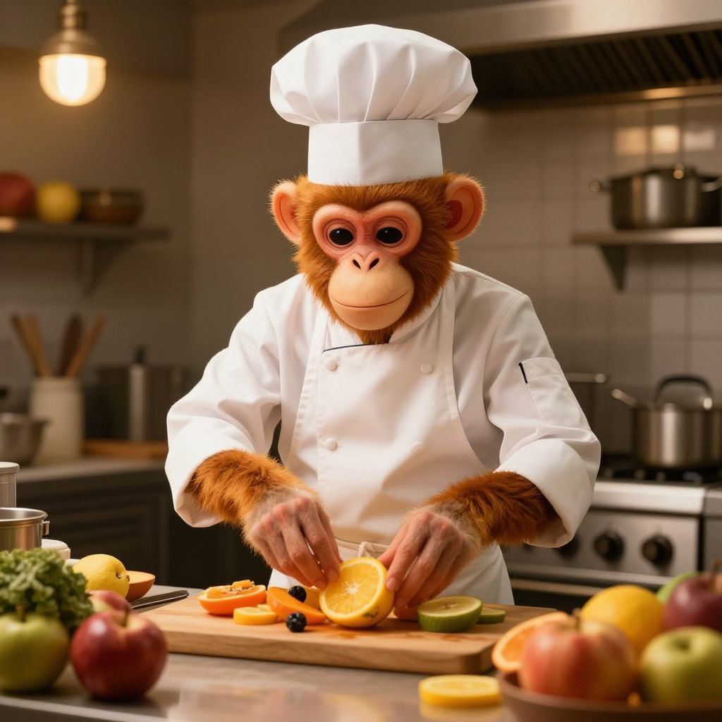 Anthropomorphic monkey chef in a bustling kitchen, wearing a white apron and chef hat, preparing exotic fruits, warm lighting, detailed kitchen environment.