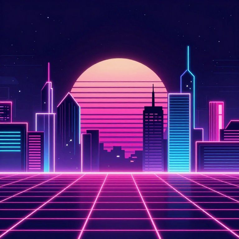 Backgroundlol showcasing a retro 80s inspired neon cityscape at night, bold geometric designs with glowing grid lines and vibrant pinks and blues, synthwave aesthetics with a nostalgic and energetic ambiance