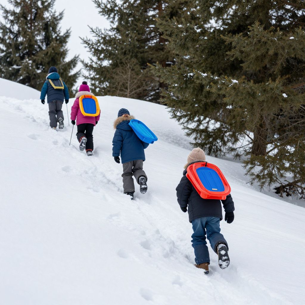 Children bundled up in warm clothes climbing a snowy hill carrying toboggans, playful footprints in pristine snow, evergreen trees framing a bright winter afternoon, joyful and energetic scene capturing the fun of wintertime activities.