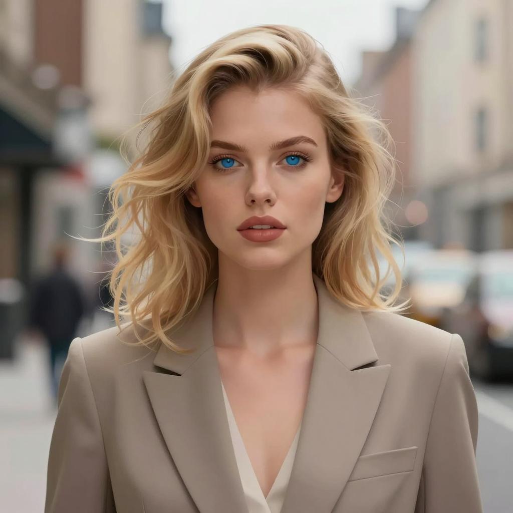 Blonde woman with long hair, wearing a patterned headscarf and grey coat, taking a selfie with a black phone. Urban background with tall buildings, street lights, and parked cars. Her eyes are closed. Number "39" in the bottom right corner.