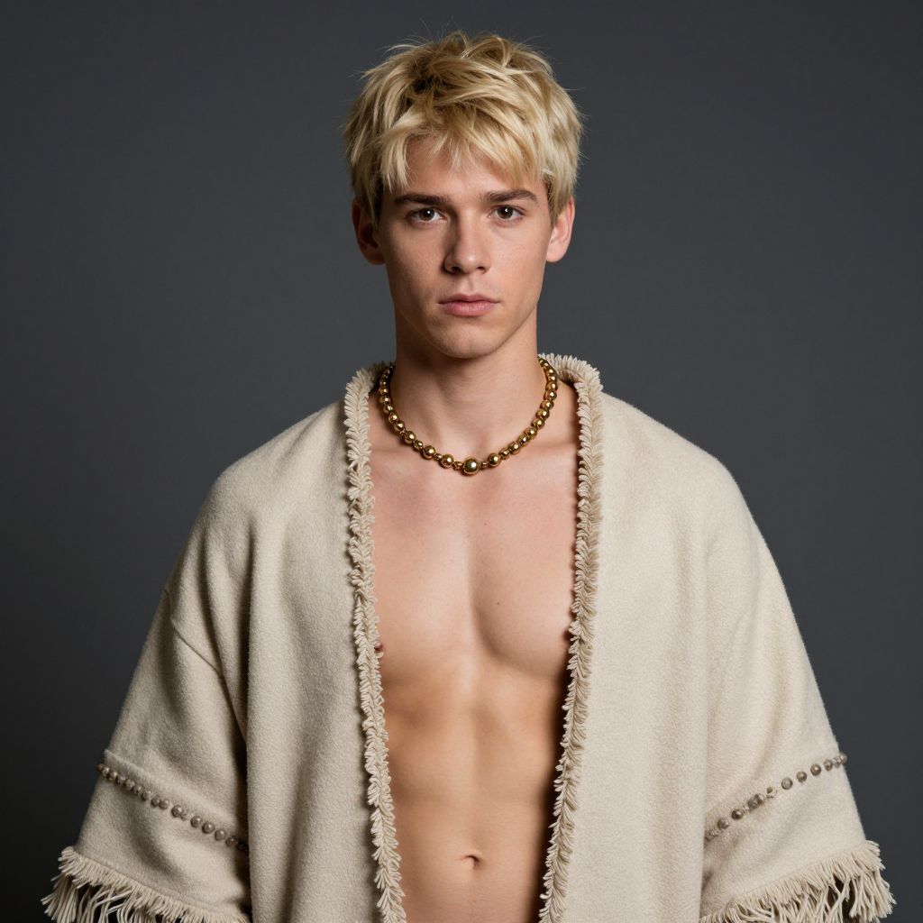 Man toga costume, solo, jewelry, 1boy, male focus, necklace, poncho, realistic, blonde hair, fringe trim, parody, navel