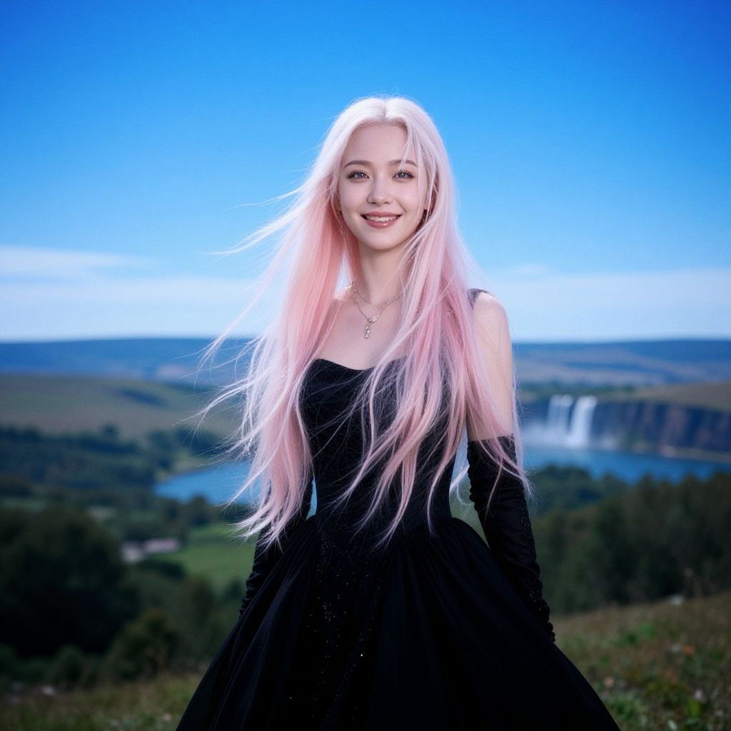 Cinematic film still Create an image of a young woman with long, flowing white-pink hair, dressed in a sleek black gown. She is standing against the backdrop of a breathtaking landscape with a beautiful, pristine sky. Her face is adorned with a warm smile, and her eyes sparkle with joy. There are numerous intricate details in her appearance, from delicate jewelry to subtle patterns on her dress. The landscape behind her is stunning, with rolling hills, lush greenery, and perhaps a serene lake or a majestic waterfall in the distance. The sky above is a clear, vivid blue, adding to the overall sense of tranquility and beauty in the scene., . shallow depth of field, vignette, highly detailed, high budget, bokeh, cinemascope, moody, epic, gorgeous, film grain, grainy