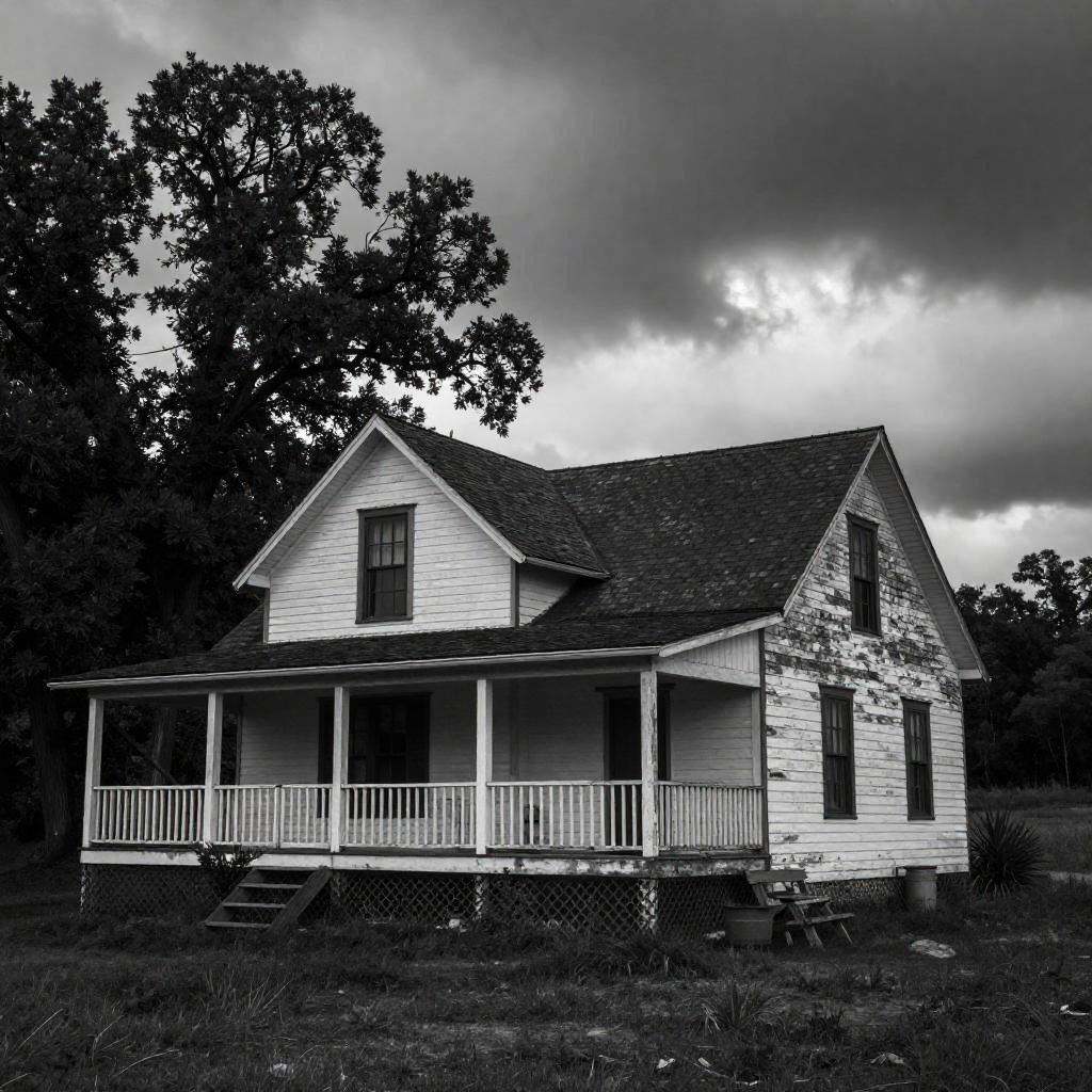 Black and white ranch house exterior in rural setting, silhouette against dramatic sky, weathered wood siding, wrap-around porch, tall trees in the background, moody black and white photography style