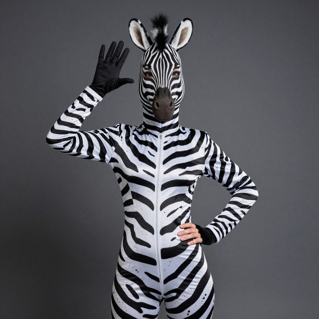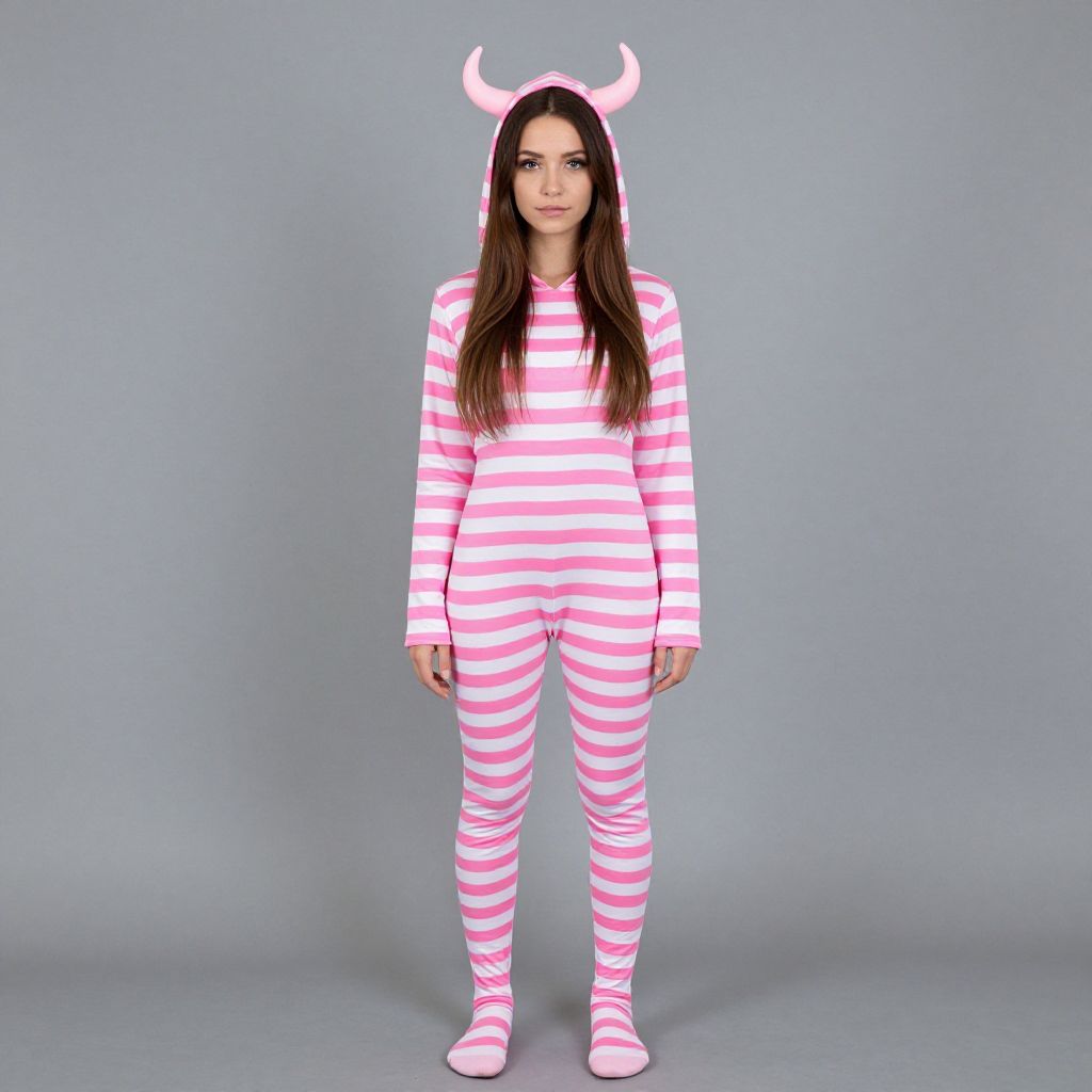 "pink woman halloween costume, 1girl, solo, full body, standing, looking at viewer, brown hair, striped clothes, cosplay, arms at sides, hood, onesie, long hair, grey background, long sleeves, horns, simple background, closed mouth, hood up, kigurumi Realistic photo of casual sexy person with pretty face"