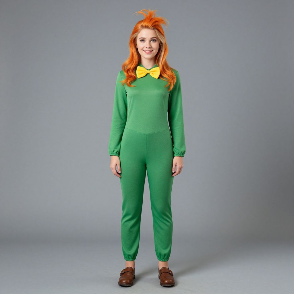 Photograph of a young woman with long, straight brown hair standing against a plain gray background. She wears a full-body pink and white horizontal striped onesie with long sleeves and pants, and a pair of small, white, horn-like headgear on top of her head. Her expression is neutral, and she stands with her arms relaxed by her sides. The onesie is form-fitting, emphasizing her slim build. The overall style is playful and slightly whimsical, with a simple, clean background that keeps the focus on her costume.