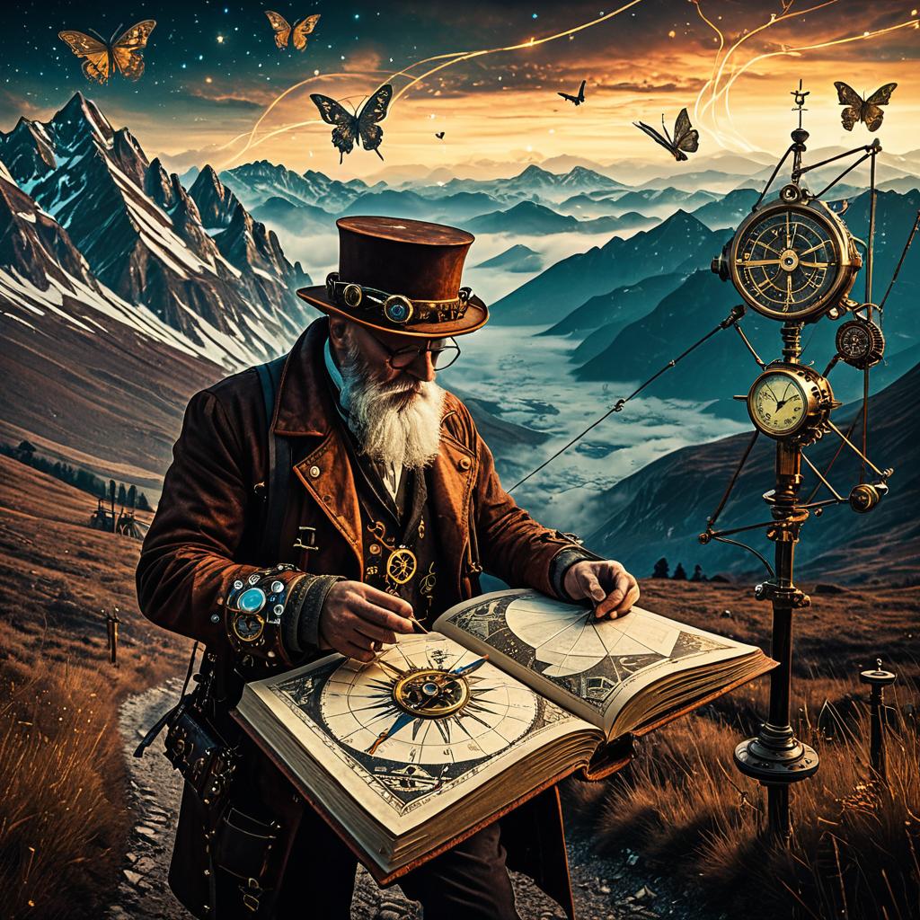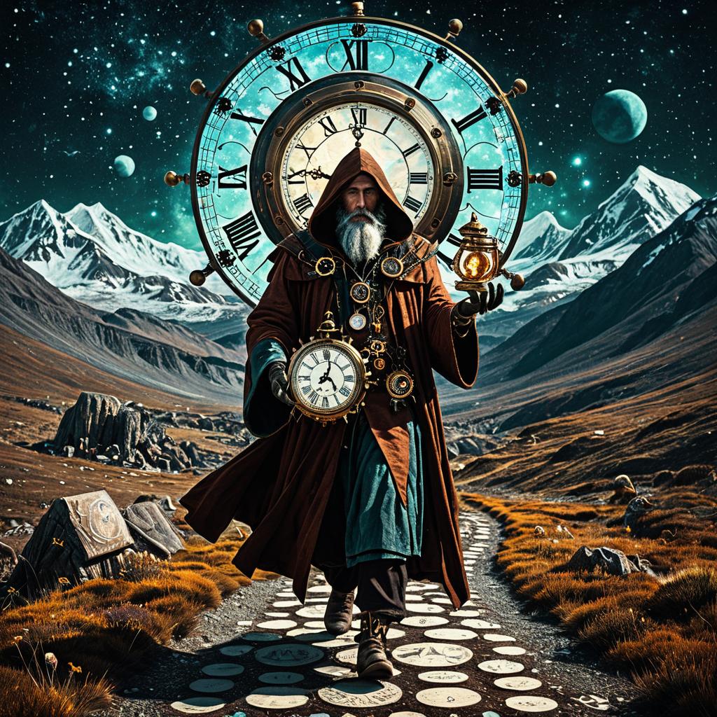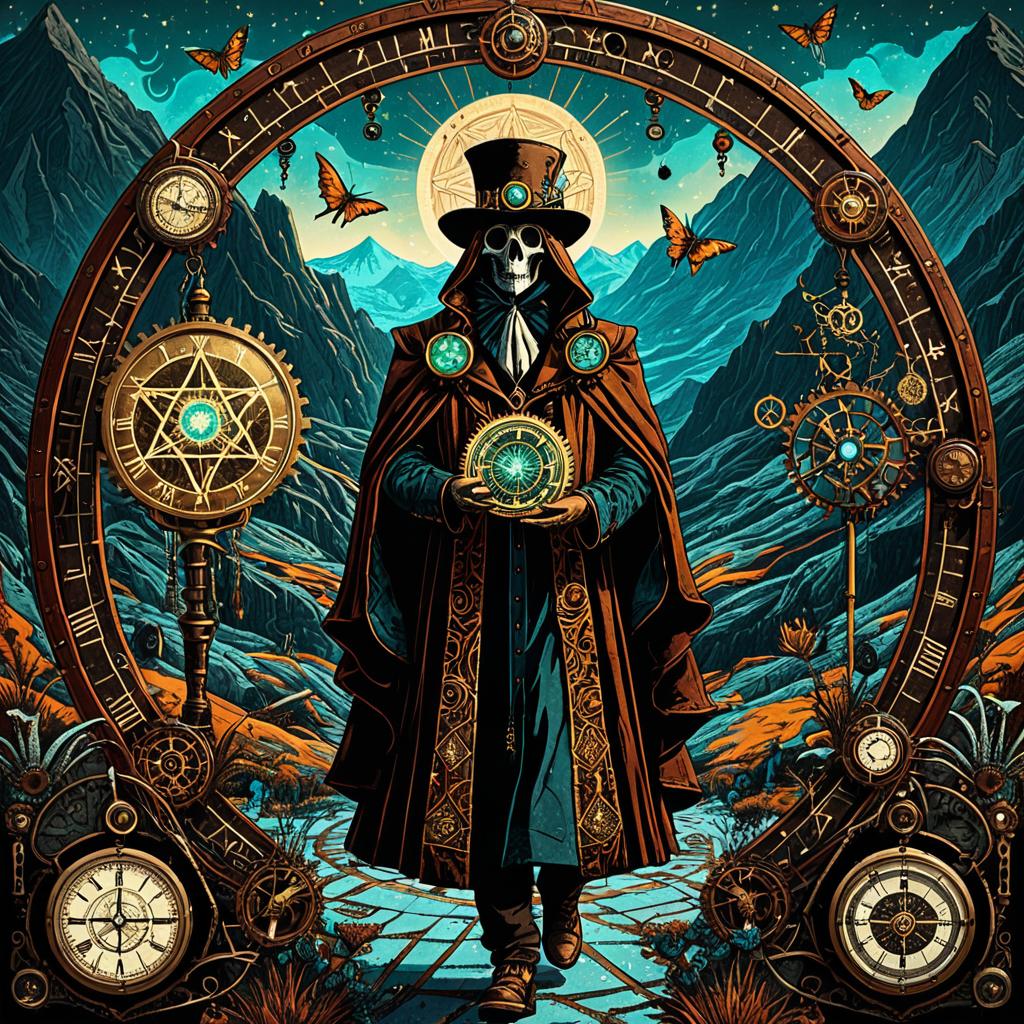 (Steampunk psychedelic artstyle), a enigmatic mask-wearing historian walking with a rusted pocket sundial and magnifying glass, surrounded by glowing spirals and brass feathers. Set against a surreal mountainous terrain with intricate engraved keys, barometers, and compass roses. The scene is illuminated by ambient glowing light, adding atmospheric depth and a whimsical, mysterious vibe. Rendered in rich earthy tones with vibrant, contrasting colors and vintage textures, ultra-detailed in HD quality. Captures the essence of The Hermit, blending mysticism with intricate steampunk details.