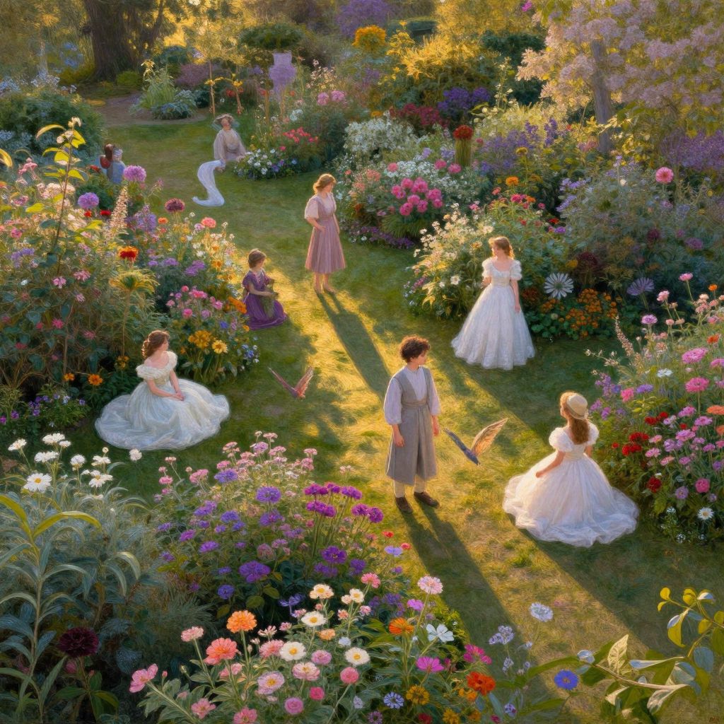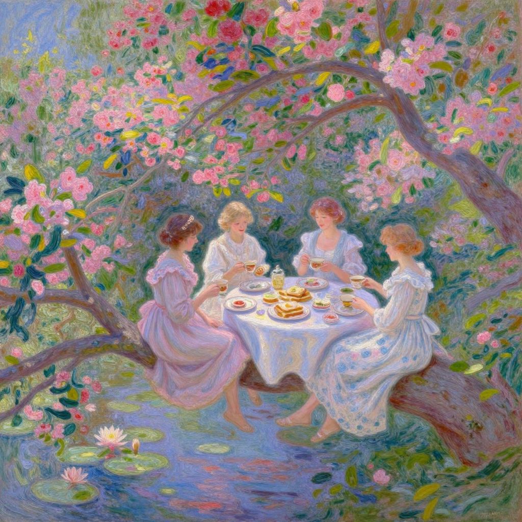 Three young girls in vintage dresses stand by a serene lake, gazing into the distance, surrounded by lush greenery and trees. Realistic painting style