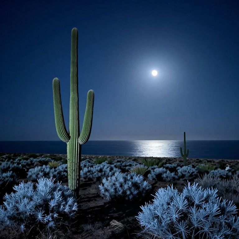 Luminous moonlight bathes a serene desert landscape, where two towering saguaro cacti stand sentinel amidst a sea of smaller, silvery-blue shrubs, their forms mirrored by the calm ocean below under a star-studded sky.
