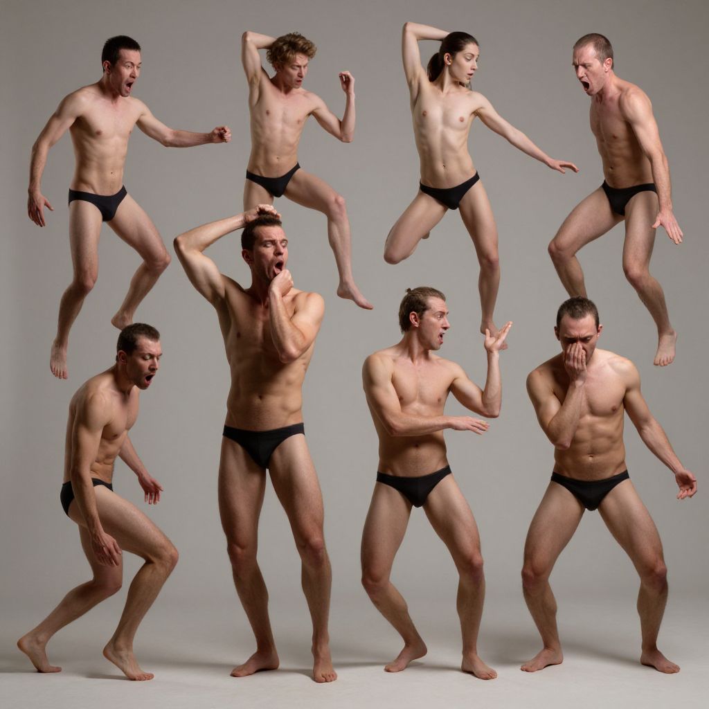 Expressive poses reference of diverse human figures in dynamic motion, showcasing exaggerated emotions and body language, set against a minimalist studio backdrop with soft lighting to highlight muscles and posture, ideal for artist anatomy study.