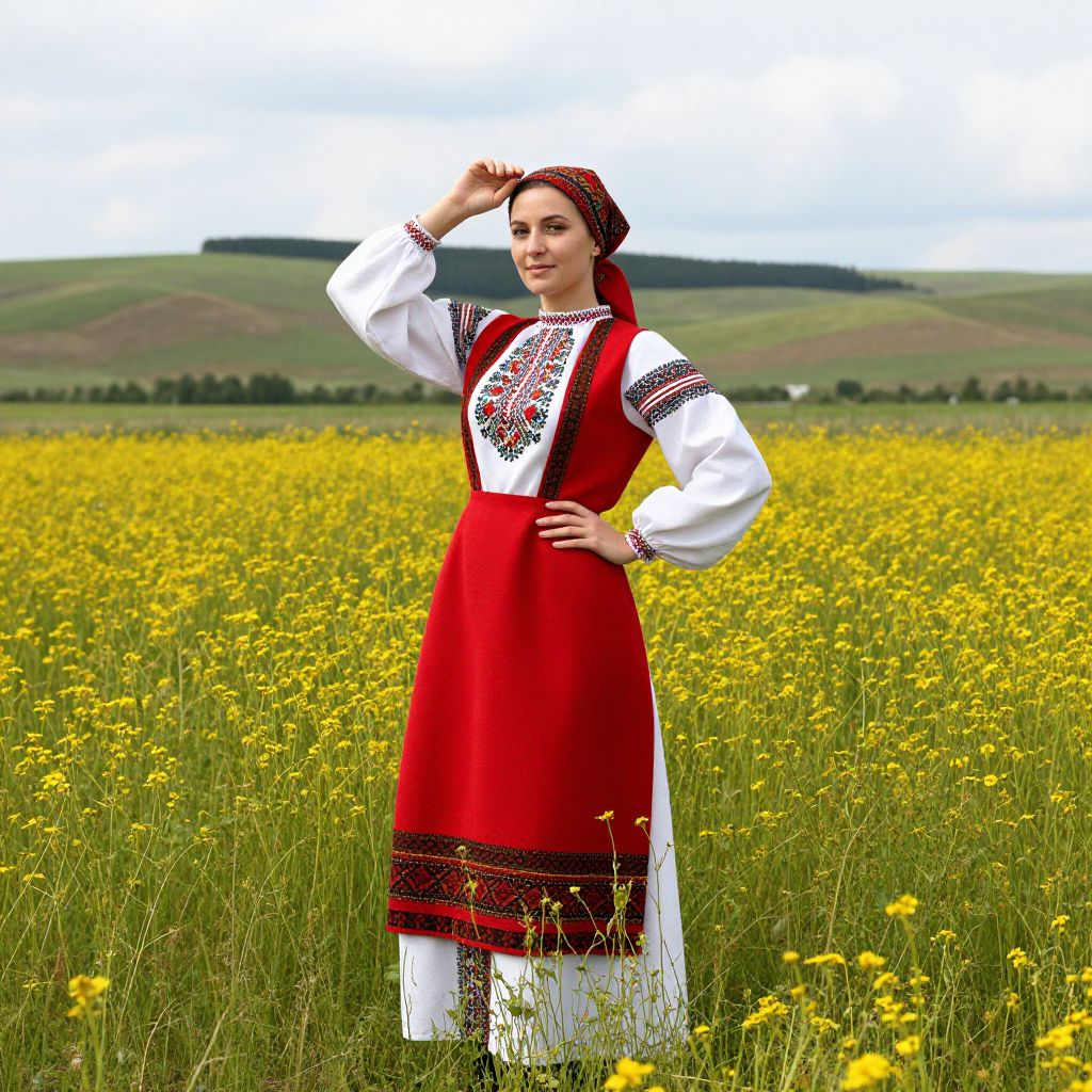 Woman wearing traditional Moldovan attire stands gracefully in a vibrant field of golden wildflowers, her red embroidered blouse and white blouse complemented by a matching headscarf, set against a backdrop of rolling hills and distant greenery under a partly cloudy sky.