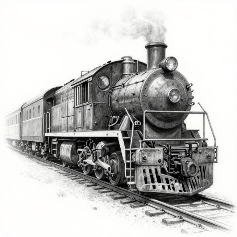 How to draw a realistic train, detailed step-by-step guide, vintage locomotive chugging along rusty tracks, intricate shading and perspective, emphasis on metal textures and steam effects, sketchbook style with pencil and charcoal, educational art tutorial composition