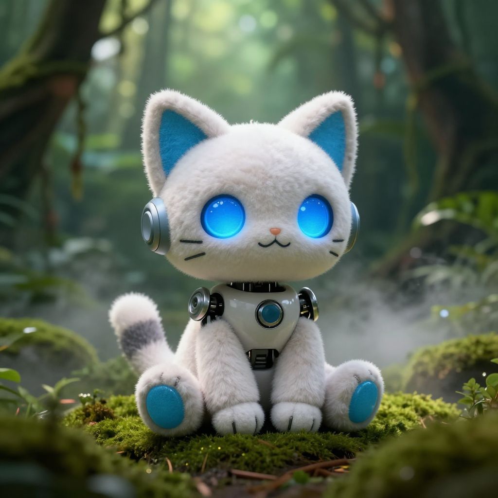 Photograph of a digital CGI character: a cute, plush white cat with large, glowing blue eyes and blue-tipped ears and paws. The cat has a soft, fuzzy texture and is equipped with small, metallic robotic components including a collar with a circular blue sensor and earpieces. The cat is sitting on a moss-covered forest floor, surrounded by lush greenery and dense trees with dappled sunlight filtering through. The background is slightly blurred, highlighting the cat as the focal point. The overall mood is whimsical and futuristic in a natural setting.