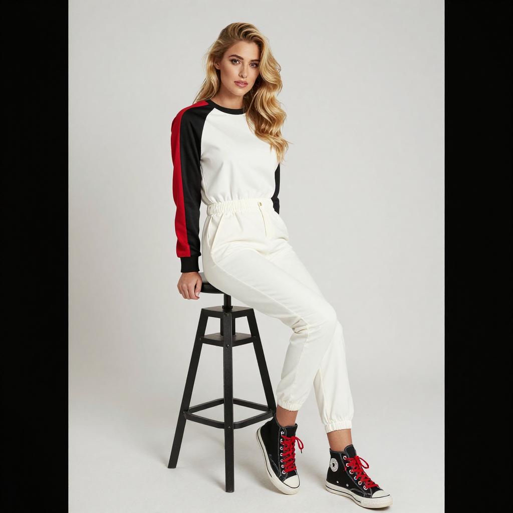 Photograph of a blonde woman with long, wavy hair, leaning on a black stool. She wears a white jumpsuit with black and red sleeves, and black high-top sneakers with red laces. Her right hand rests on the stool, and her left hand is in her pocket. The background is a plain white.