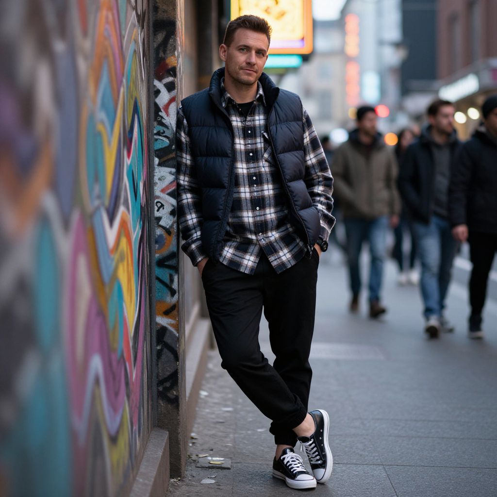 "a man, relaxed-fit plaid flannel shirt, black jogger pants, leather low-top sneakers, lightweight puffer vest, urban vibe, bright neon lights, bustling crowds, Gottfried Helnwein style, leaning against a graffiti wall, confident smirk.Man has masculine face and piercing eyes"