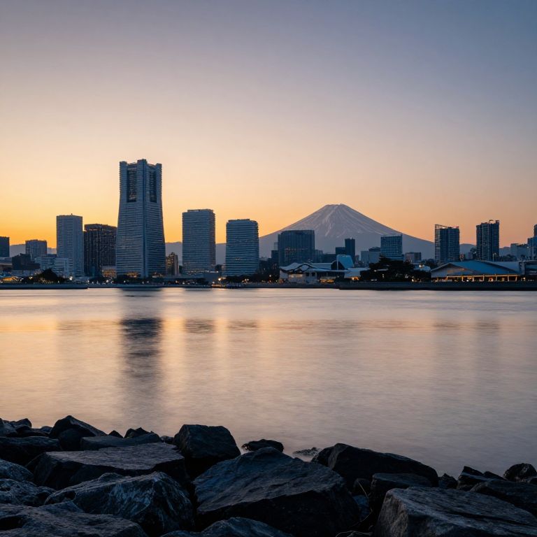 The image captures a stunning early morning view of Yokohama, Japan, from the seaside. The city's skyline, featuring a mix of modern skyscrapers and older buildings, stretches across the horizon, with the iconic Mount Fuji standing majestically in the background. The sun is just beginning to rise, casting a warm, golden glow over the scene and creating a dramatic contrast with the cool tones of the cityscape. The water in the foreground is calm, reflecting the sky and the city's lights, while the rocky shoreline in the foreground adds texture and depth to the composition. The overall scene is photo-realistic and cinematic, with a harmonious blend of natural and urban elements, creating a serene and picturesque landscape.