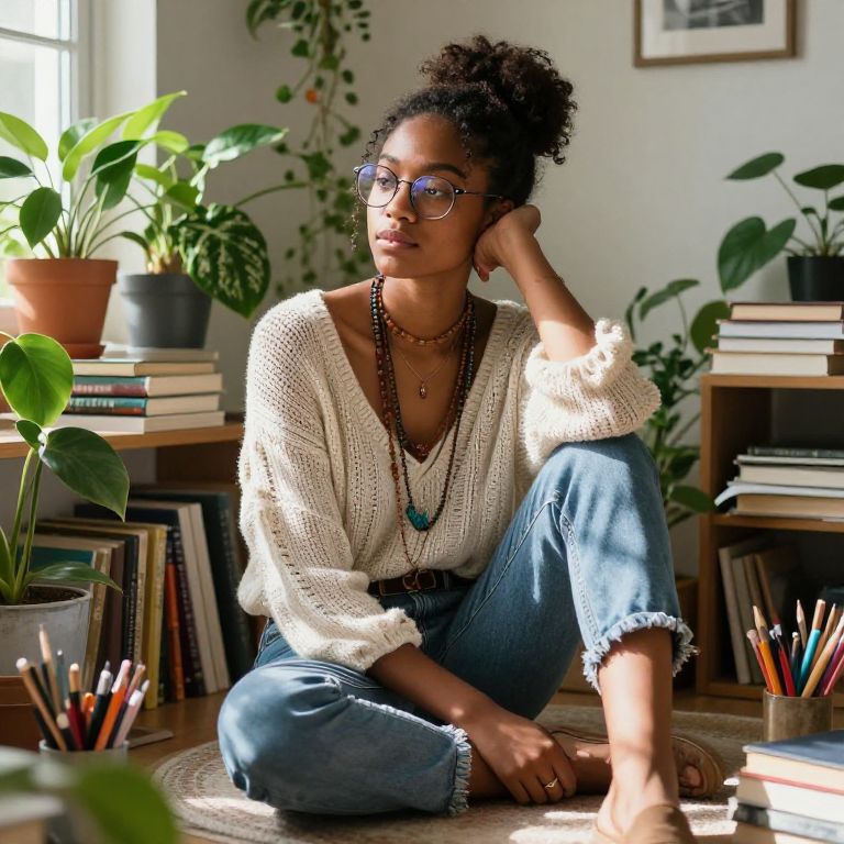 A woman in her early 30s with warm brown skin, soft brown eyes, and natural curly hair walks through a quiet city park in the evening, dressed in a loose floral print sweater, jeans, and comfortable boots, holding a book and enjoying the breeze under a cherry blossom tree lit by soft street lamps.