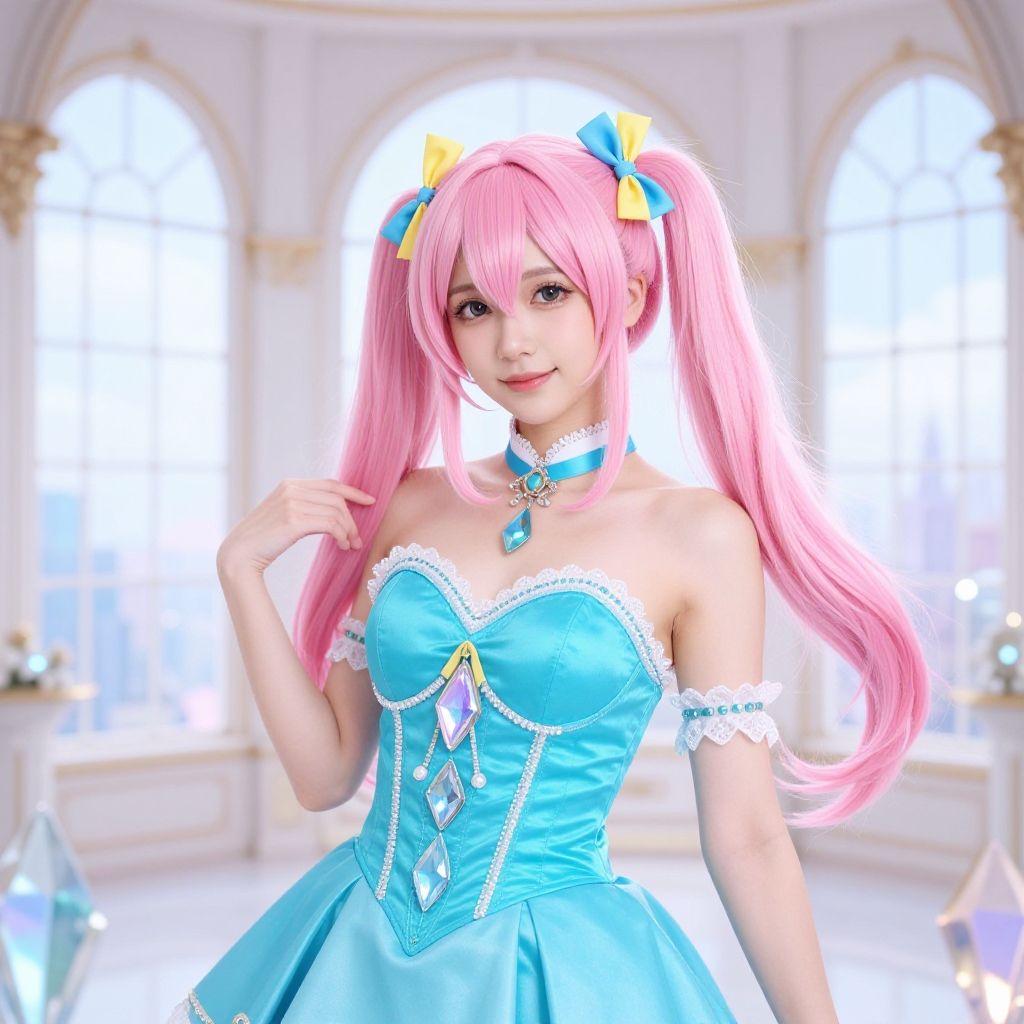 A vibrant digital artwork featuring a woman with striking pink twin-tail hair adorned with yellow and blue bows, wearing a turquoise blue corset-style outfit with crystal-like embellishments. The scene is set in an elegant, softly lit room with large arched windows and crystalline decorations, blending fantasy and modern anime aesthetics.