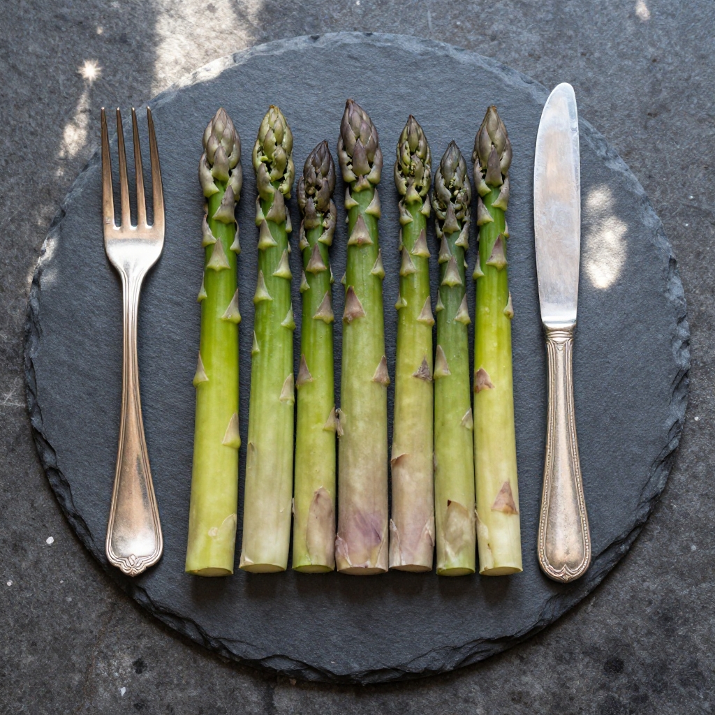Top view of asparagus silverware arranged neatly with spring asparagus on a rustic slate platter, natural textures, sunlight filtering through, documentary style food photography