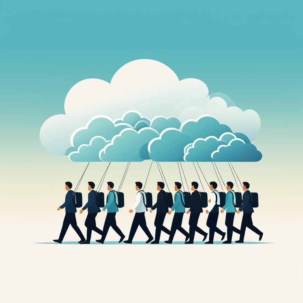 A digital illustration of a Scrum team journeying to the cloud, flat, minimalistic style with gradient color palette, each team member with distinct characteristics, emphasizing their strengths and contributions