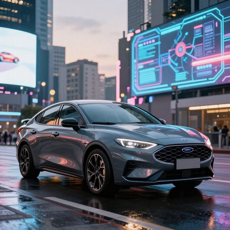 Ford Falcon 2024 in a high-tech urban environment, surrounded by holographic billboards, aggressive stance, glossy gunmetal gray paint, dusk setting with reflective wet streets, hyperrealistic