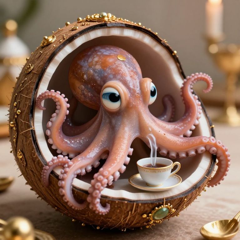 Emerging from an intricately carved coconut shell adorned with golden embellishments, a whimsical octopus with oversized, expressive eyes and tentacles brimming with personality prepares to host a surreal tea party for unseen guests.