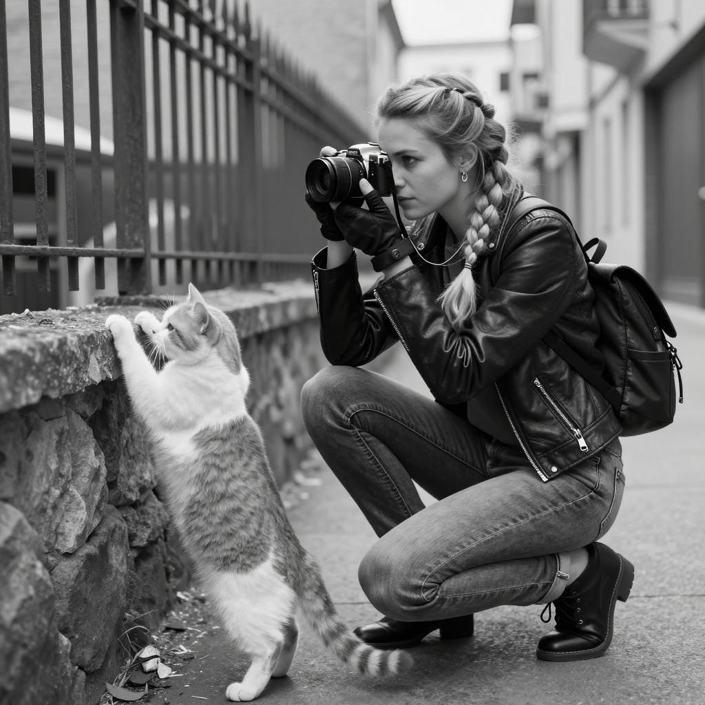 Black and white photo of a woman with long blonde hair and braids, crouching, wearing a leather jacket, gloves, and jeans. She holds a camera to her face, looking through the viewfinder. A cat with a white and orange coat stands on its hind legs, leaning against a stone wall. The woman has a small backpack. Urban alleyway background with metal fencing and buildings.
