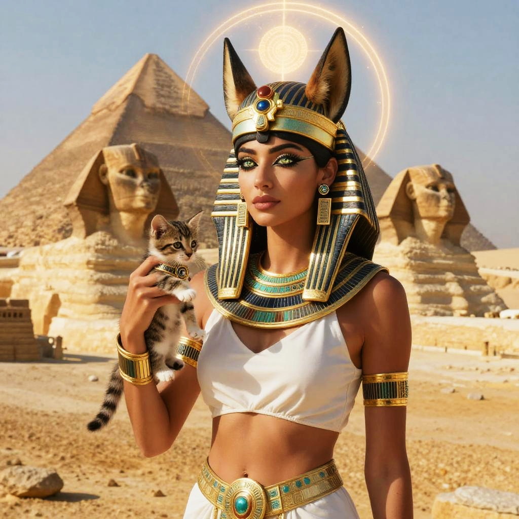 (best quality:1.4), (ultra highres:1.2), (photorealistic:1.4), (8k, RAW photo:1.2), ultra detailed, (techwear:1.3), a woman, (shining eyes looking at viewer:1.4), (animal ear:1.3), (egypt goddess casting holy spell:1.2), (holding little small tiny kitten looking left:1.3), long hair, (golden accessories:1.2), navel, necklace (black and gold theme:1.3), (great pyramid and sphynx:1.4), (holy light:1.4)