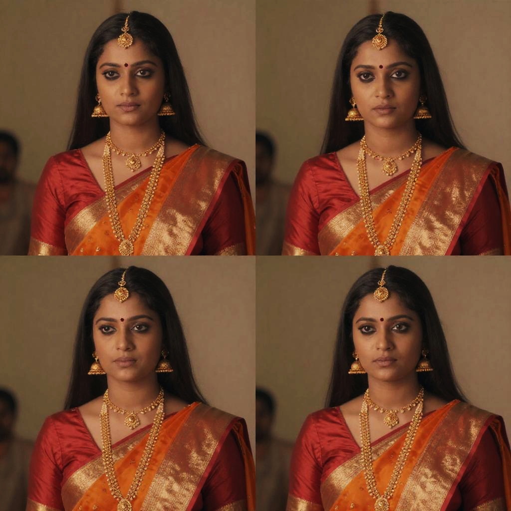 This is a collage of four photographs featuring a beautiful South Asian woman with long black hair, wearing a traditional red and orange saree with a gold border. She has a delicate gold forehead bindi, a long necklace, and a serious expression. Each photo shows her from different angles, highlighting her elegant attire and traditional jewelry against a blurred, warm-toned background.