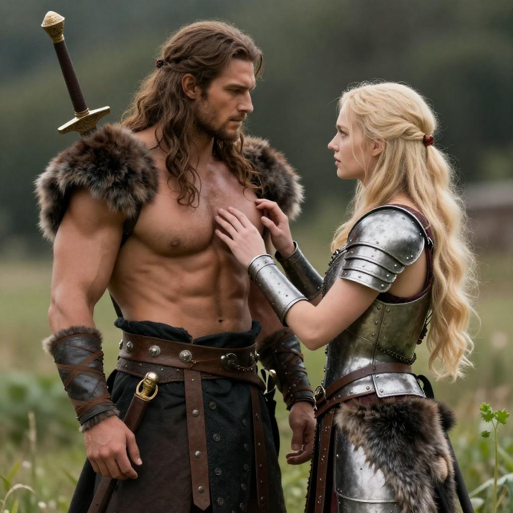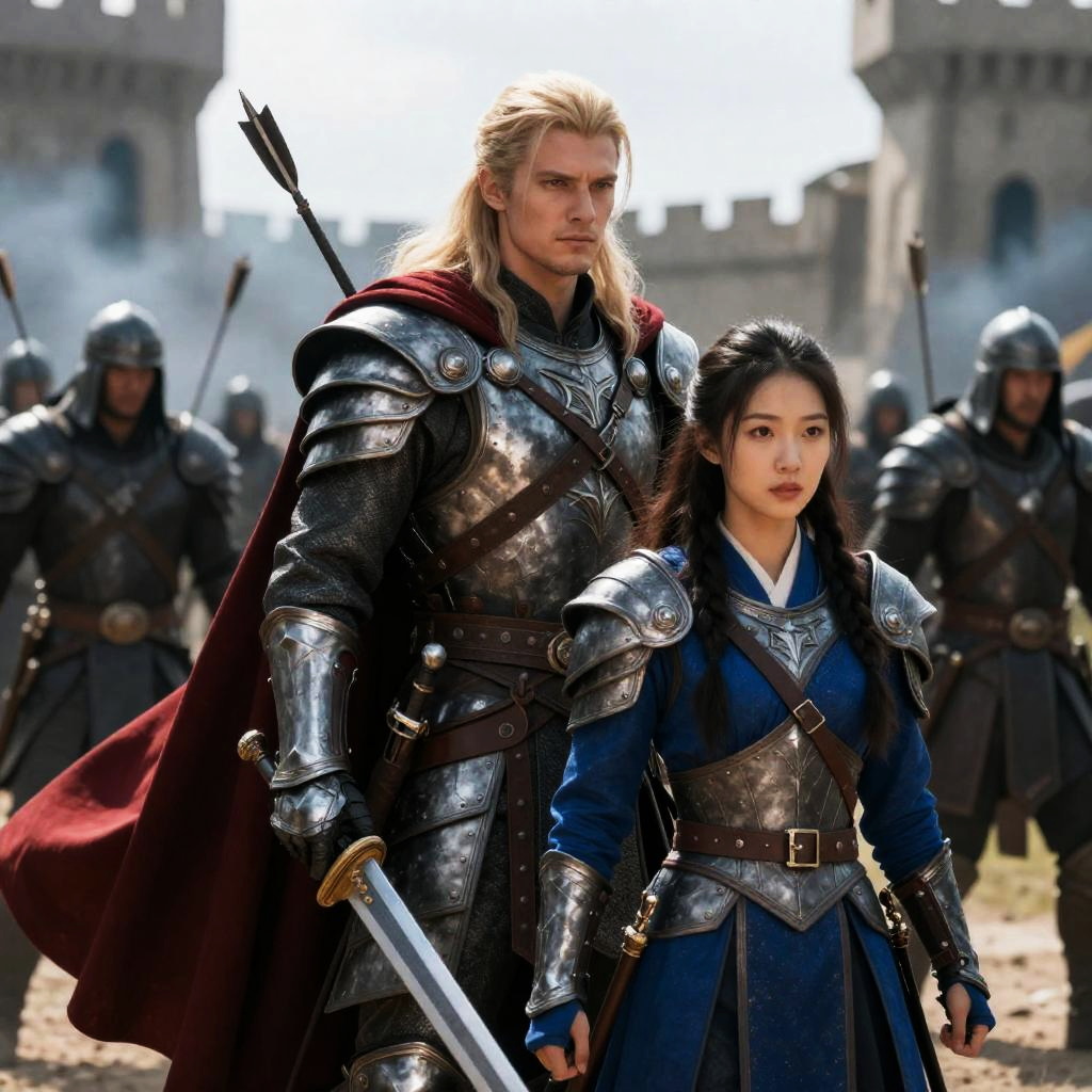 Epic fantasy battle scene. Blonde man with long hair in armored red cloak and silver armor stands protectively in front of young Asian woman with long hair in blue armor. Multiple armed warriors in background. Flying arrows, castle ruins, smoke, intense expressions. Man's face stern, woman's face focused.