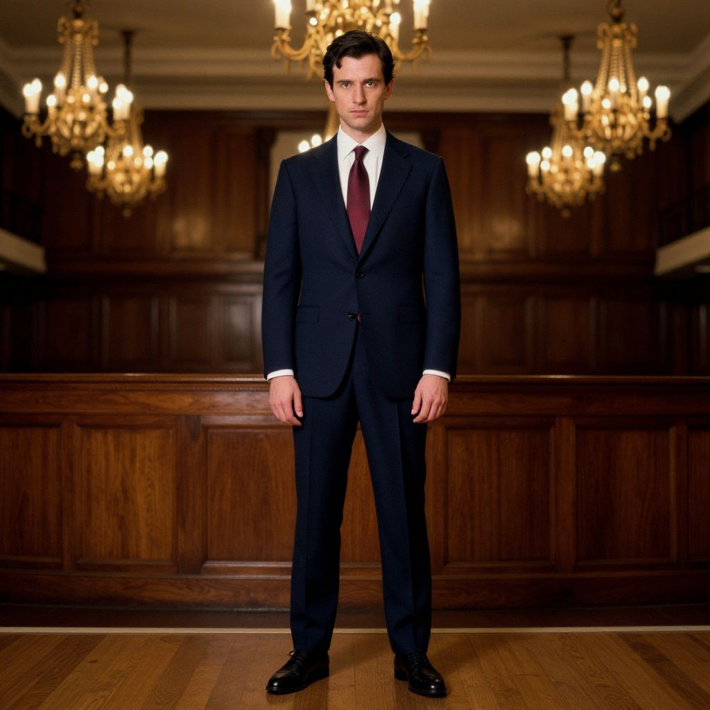 A man, navy wool suit, crisp white dress shirt, silk burgundy tie, polished black leather shoes, classic fit silhouette, historic ballroom, ornate chandeliers, rich wood paneling, kodacolor analog film, confident expression Man has masculine face and piercing eyes