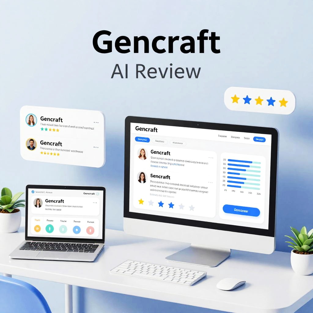 Gencraft AI review theme showing a seamless integration of AI in daily workflow, multiple devices and screens displaying user reviews, AI performance metrics, clean modern digital workspace, soft pastel color palette, emphasizing innovation and technology.