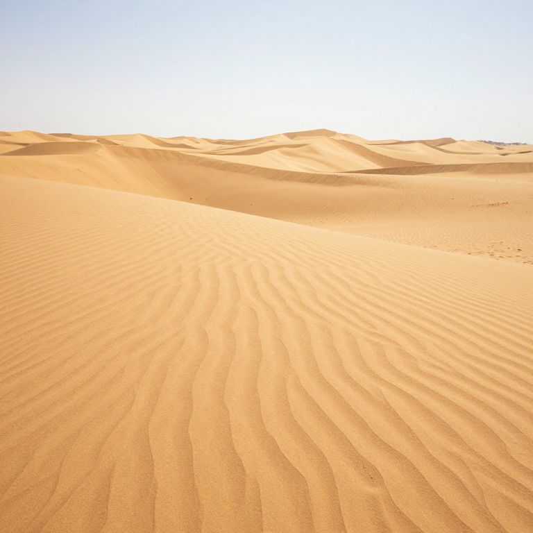 Golden sand dunes stretch endlessly under a clear sky, their rippling surfaces textured with intricate patterns that shimmer in the sunlight, evoking a sense of timeless serenity and forgotten histories.