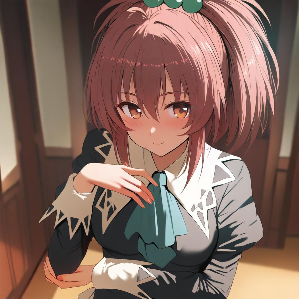 Digital illustration of an anime girl with red hair tied in a ponytail and red eyes. The character is wearing a black and white school uniform with a green necktie. She is posing with one hand near her face, positioned indoors near a window with blurred greenery outside.