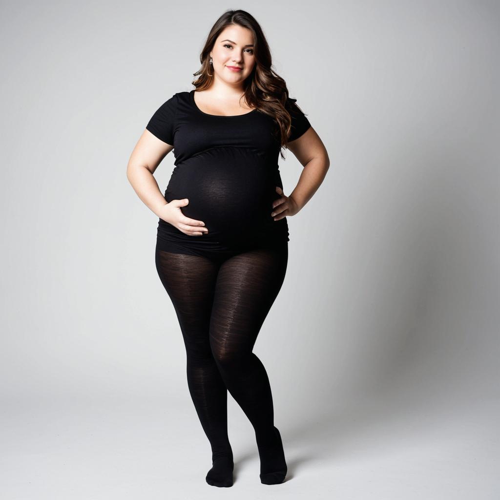 Plus Size Fancy Dress Tights, a pregnant woman in a black top and black pants posing for a picture