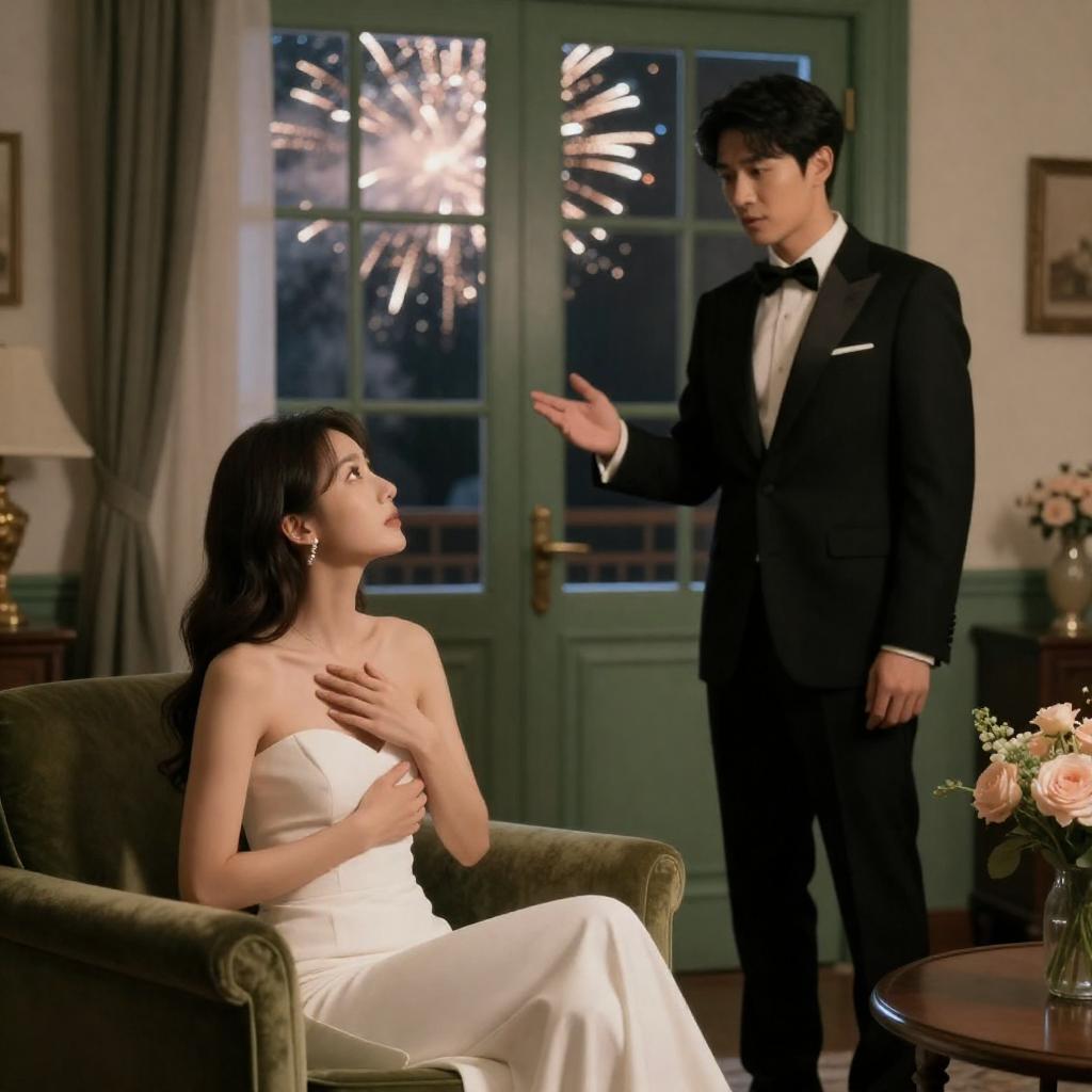 Photograph of a man and woman in a dimly lit room. Woman in a strapless white dress, holding her chest, looking up. Man in a black tuxedo, standing near a green door, gesturing with his right hand. Fireworks visible through window. Green armchair in foreground, table with flowers to the right. Both facing each other, intense expressions.