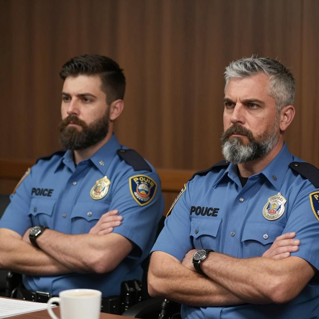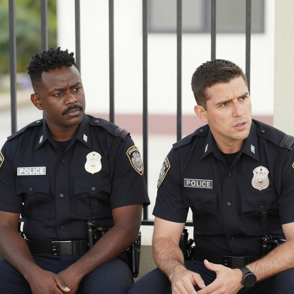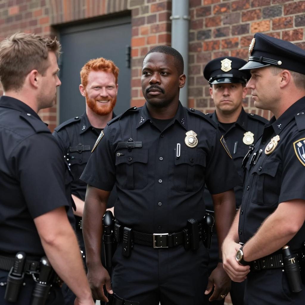 Photograph of a group of people, including three police officers, in a brick alleyway. Central black male officer with mustache, black uniform, stands amidst red-haired man, smiling, and other men. Two officers in black uniforms, one with peaked cap, to his right. Background includes brick wall and metal door. Five people visible, intense expressions on red-haired man and central officer.