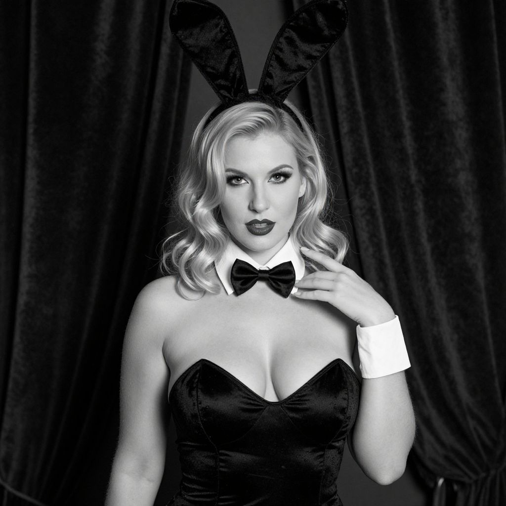 Black-and-white photo of a sultry blonde woman with wavy hair, wearing a black bunny costume with a bow tie and large bunny ears. She has dark lipstick and a confident gaze, with one hand lightly touching her neck. The background features dark, velvety curtains, adding a dramatic, vintage vibe. Her outfit accentuates her curvy figure and ample cleavage.