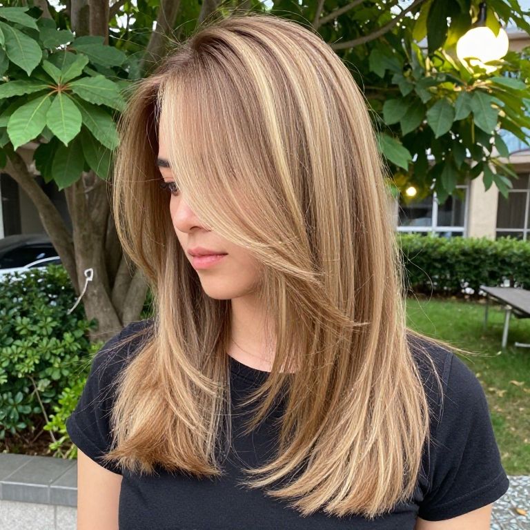 Langhaarschnitt trend hairstyle featuring long, layered hair cascading over shoulders, subtle balayage color effect blending blonde and brown tones, outdoor garden lighting, casual chic outfit, ultra realistic texture and shading