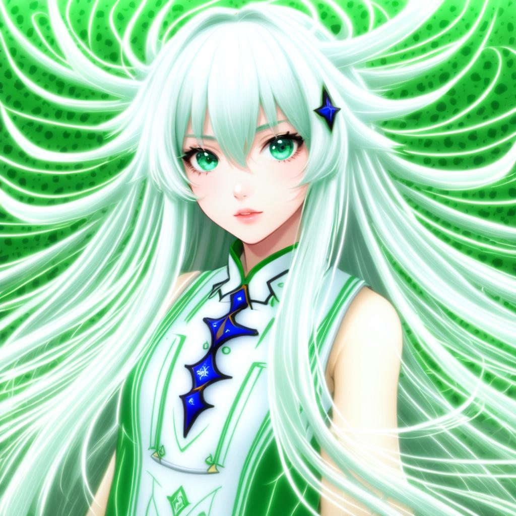 Digital anime-style illustration of a young female character with long white hair and vibrant green eyes. She wears a green and white outfit adorned with blue decorative elements. The character's hair flows outward in multiple strands against a green patterned background, highlighting her serene expression and detailed anime features.