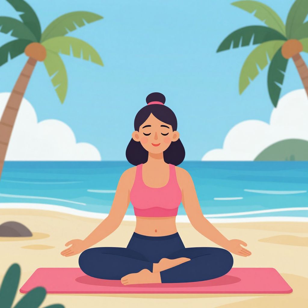 Digital illustration of a smiling woman with fair skin and black hair in a bun, practicing yoga on a blue mat at a beach. She wears a pink sports bra and black yoga pants, sitting cross-legged with hands resting on her knees and eyes closed. The background features a bright blue sky with white clouds, a calm blue ocean, and two palm trees on sandy shores. The scene is vibrant and serene.