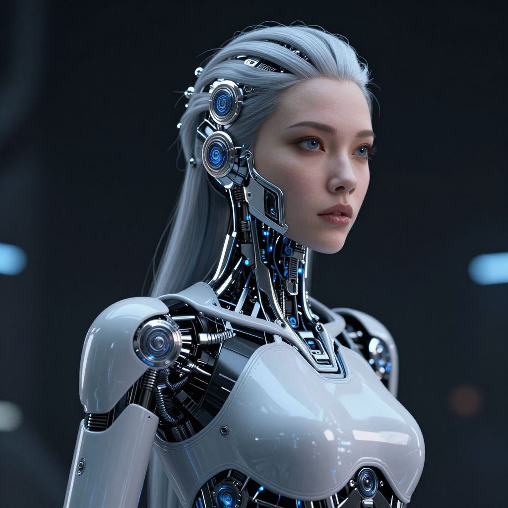 A highly detailed CGI image of a futuristic, female android with pale skin and long, silver hair. Her hair is adorned with small, circular, blue-lit devices. She has blue eyes and a serene expression. Her body is covered in sleek, white, metallic armor with blue and silver accents, exposing intricate mechanical components. The background is dark and blurred, emphasizing her illuminated features. Her shoulders and chest are prominently armored, with smooth, glossy textures contrasting the exposed mechanical parts. The overall style is reminiscent of sci-fi and cyberpunk aesthetics.