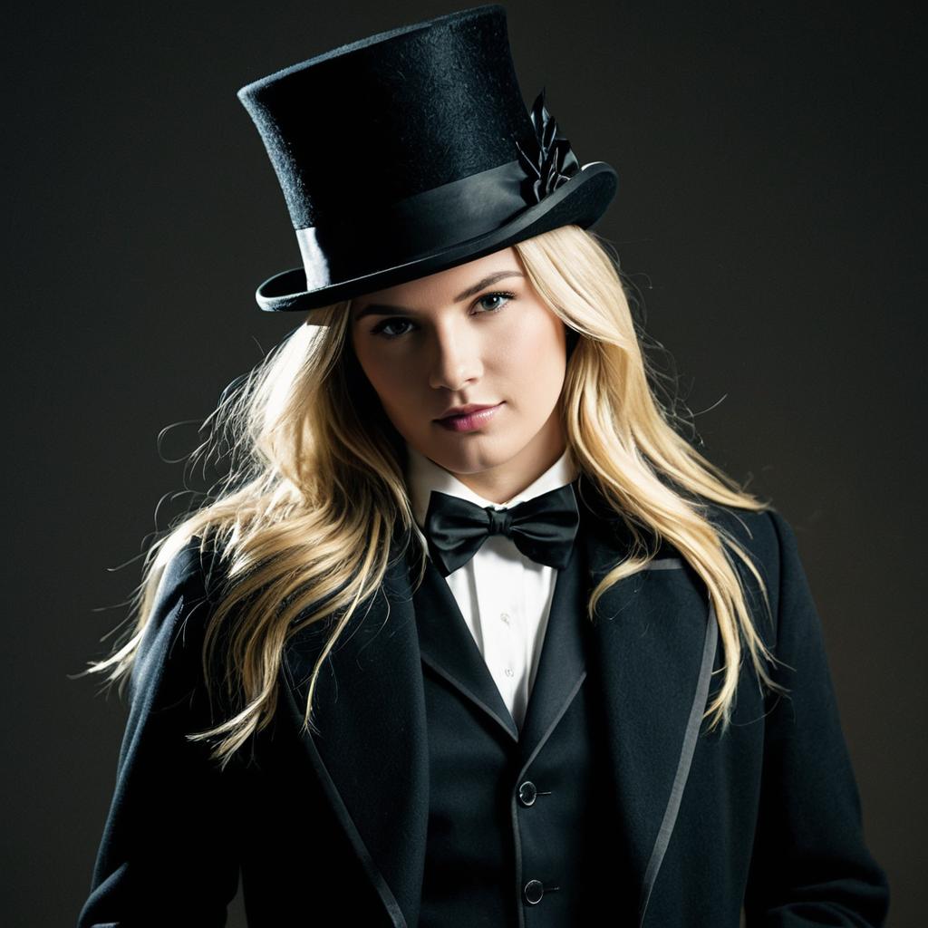Magic magician costume ,solo, hat, blonde hair, top hat, bow, bowtie, realistic, 1girl, coat, long hair, male focus