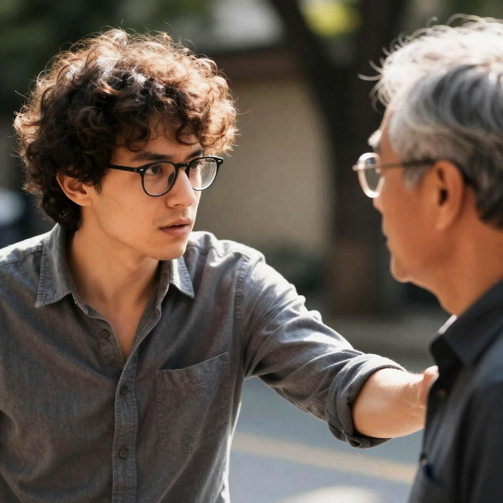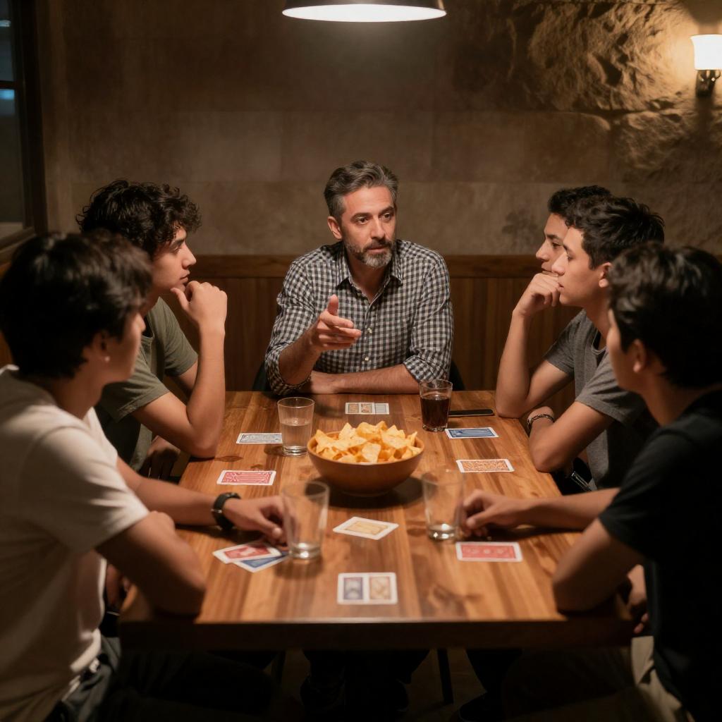 Four people engaged in an indoor conversation. Two young men with dark curly hair and glasses wearing black shirts, a woman with long brown hair and glasses in an orange sweater facing them, and an older man with a beard, wearing a brown hat and black jacket, pointing during the discussion. Background features a blurred TV screen.