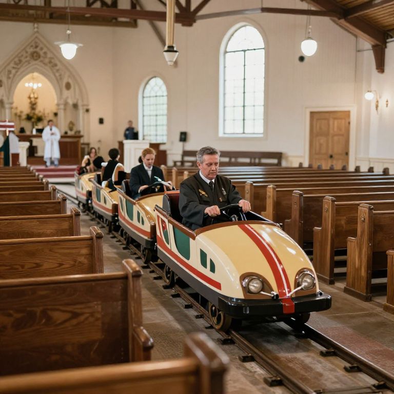 Acclaimed inside of rural rollercoaster church where the pews are on tracks, the preacher is down front and, when the cars release the fly by the preacher,