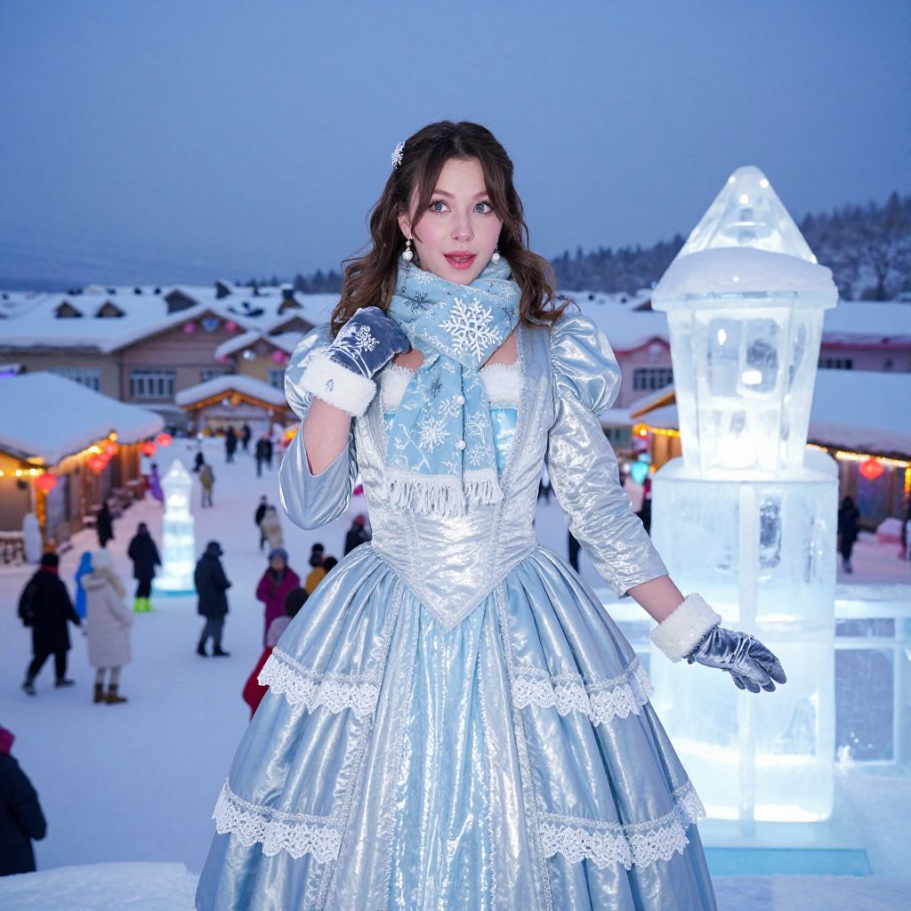 Photograph of a young woman with fair skin and dark brown wavy hair, wearing a silver, Victorian-style dress with lace trim and puffed sleeves. She holds a blue-gloved hand to her face, standing on a snowy outdoor ice rink. The background features illuminated ice sculptures, including a tall, transparent tower, and festive market stalls with warm lights and people in winter clothing. The sky is a dusky blue, and snow-covered buildings are visible in the distance. The woman's expression is slightly surprised, adding a whimsical touch to the scene.