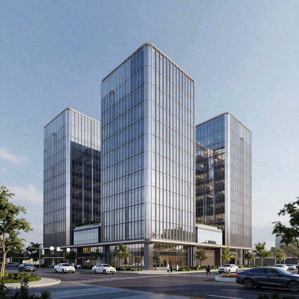 High-definition aerial perspective of a modern urban cityscape featuring multiple skyscrapers and well-planned streets. The city design incorporates green rooftop spaces and wide intersecting roads surrounded by various contemporary commercial and residential high-rise buildings. Soft natural daylight illuminates the city, emphasizing a neutral, monochromatic color palette with subtle vibrant highlights.